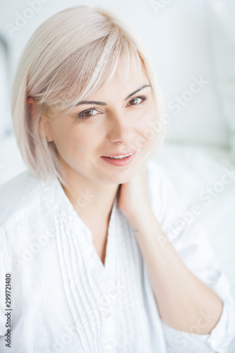 Attractive mature woman portrait. Female indoors. Beautiful blond middle adult woman closeup portrait.