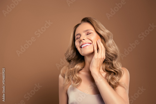 Attractive mature woman with a radiant smile posing in a relaxed mood against a beige background