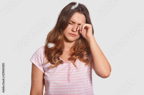 Attractive sleepy female rubs eyes, hates awake early, has feathers on head, dressed in pyjamas, isolated over white background. Sleepless young woman worked long during night. Morning time.