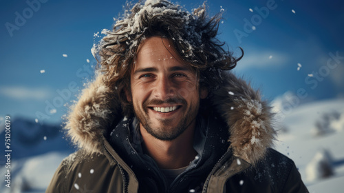 Attractive smiling handsome winter man wearing thick animal fur jacket smiling broadly looking at camera on bright snowy winter day