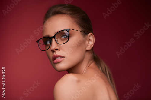 Attractive woman in square eyeglasses looking at camera on red background. Portrait of young beautiful blonde girl.Black frame spectacles.Vision correction,optical shop,glasses store,eyewear concept.