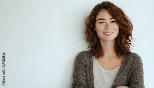 Attractive woman smiles against a simple white wall background