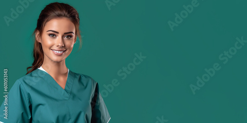 Attractive woman wearing medical scrubs, isolated on green background. Place holder, copy space banner for medical and beauty industry
