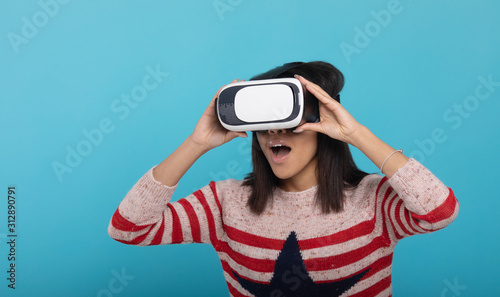 Attractive woman wearing virtual reality goggles. VR headset. Virtual reality concept on blue background.
