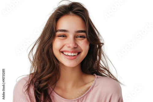 Attractive woman with bright smile wearing casual clothes, isolated on white background