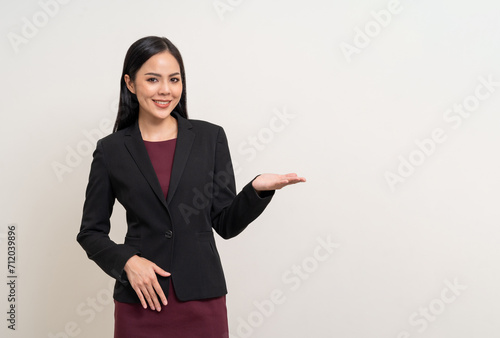 Attractive Young asian business woman smiling to camera standing pose on isolated white background. Latin Female around 25 in black suit portrait shot in studio.