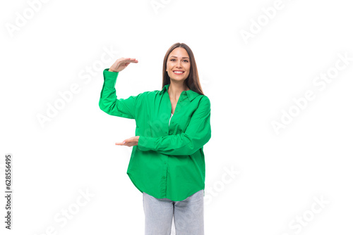 attractive young brown-haired female model with brown eyes in green shirt isolated on white background