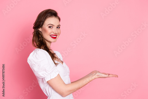 Attractive young woman presenting with an open hand gesture against a pink background showcasing beauty and charm