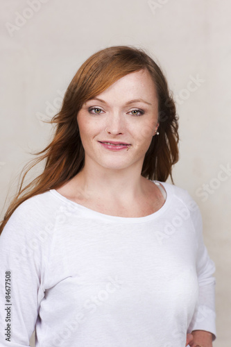 Attraktive rothaarige junge Frau mit weißem T-Shirt
