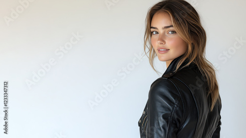Australian happy woman wearing black leather jacket smiling isolated on white background