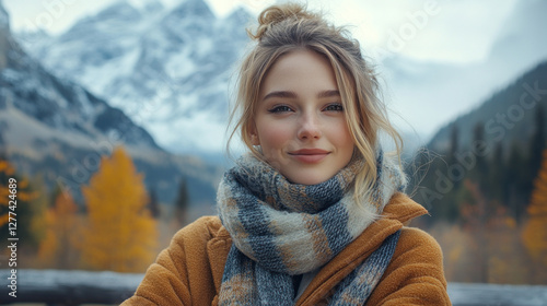 Australian woman wearing a coat sitting on a bench enjoying the view of the Canadian Rockies