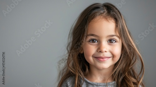 Authentic Portrait Of A Small Girl With Long Brown Hair, Smiling Genuinely