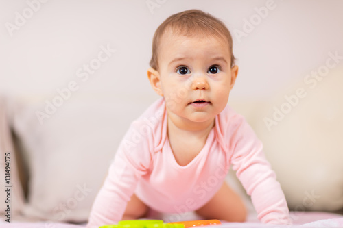 Baby girl crawling on the bed / Cute 8 months old baby girl learns to crawl