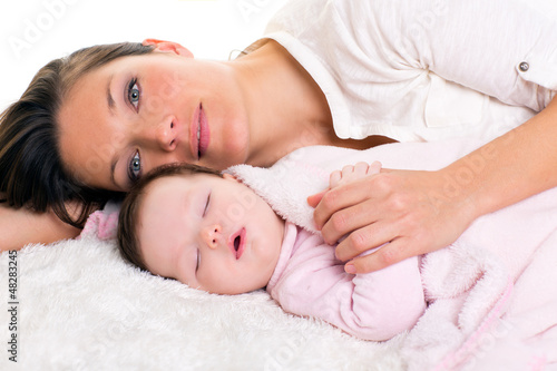Baby girl sleeping with mother care near