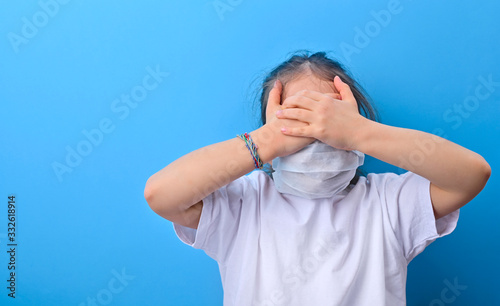 Baby in coronavirus. World pandemic concept COVID 19. Little girl in a protective medical mask closes her eyes with her hands. The emotions of the child in the photo. Copy space and blu background