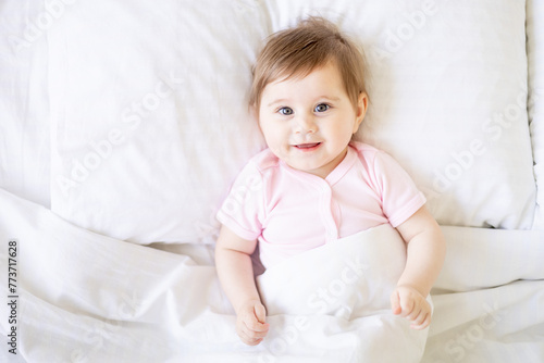 baby newborn girl on a white crib in a bright bedroom close-up in pink clothes smiling or laughing, place for text, top view