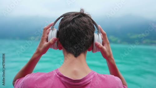 Back of young boy putting headphones over ear while standing in lake shire view. Teenager listening to music, podcast, or audiobook, contemplating nature