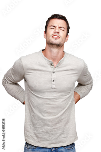 Back pain, spine injury and studio man with emergency crisis, anatomy problem or inflammation. Medical healthcare, muscle strain accident and hurt young model with fibromyalgia on white background