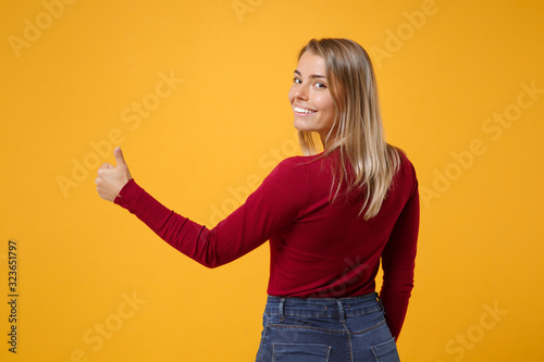 Back rear view of smiling young blonde woman girl in casual clothes posing isolated on yellow orange wall background. People lifestyle concept. Mock up copy space. Showing thumb up looking camera.