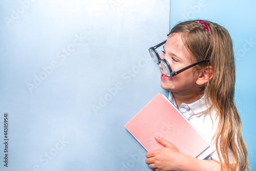 Back to school concept. School invitation, advertisement banner. Cute primary student schoolgirl in white blue classic uniform, funny glasses. Colorful bright blue trendy background copy space