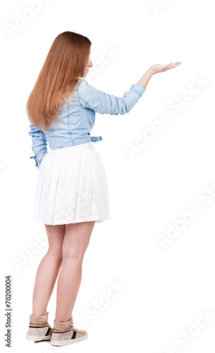 Back view of Beautiful woman in dress looking at wall and Holds
