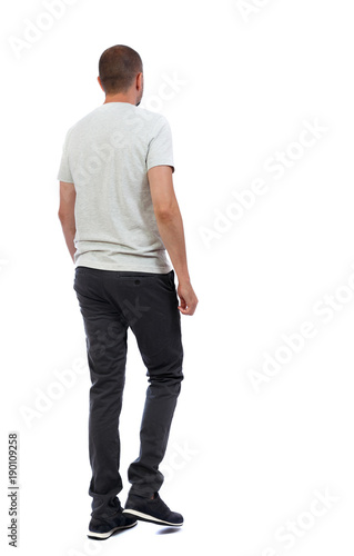Back view of going handsome man. walking young guy . Rear view people collection. backside view of person. Isolated over white background. A guy in a white T-shirt and trousers pass by.