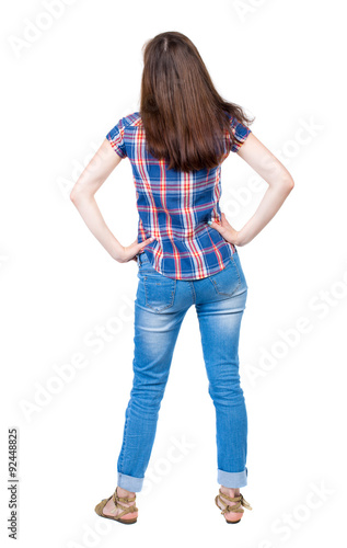 back view of standing young beautiful woman. girl watching. Rear view people collection. A young girl in a checkered blue shirt is resting in the palm of her waist.