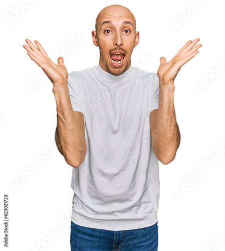 Bald man with beard wearing casual white t shirt celebrating crazy and amazed for success with arms raised and open eyes screaming excited. winner concept