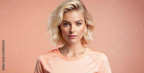 Banner, Close up portrait of a blond sport woman with peach fuzz color shirt on a pastel peach background studio shot