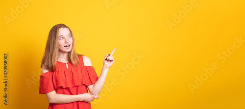 Banner. Smiling young girl customer with braces on the teeth looking sideways and pointing her index finger at copy space on white blank studio wall for your text or promotional content.