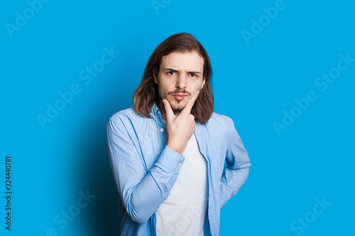 Bearded caucasian entrepreneur with long brown hair feeling indecisive on a blue background holding his hand on the chin