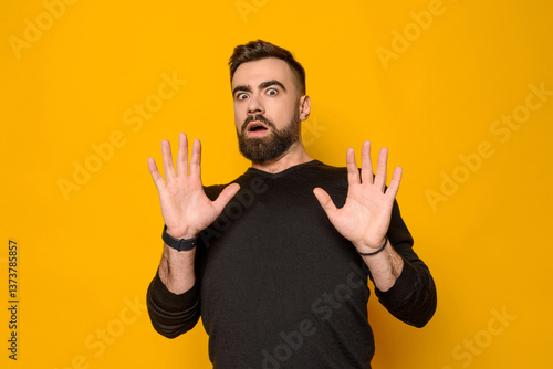Bearded confident man expresses amazement
