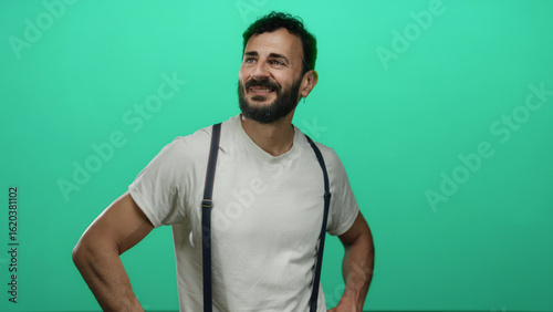 Bearded hispanic man smiling confidently with hands on hips against a vivid green background wearing a casual white shirt and suspenders in a studio setting