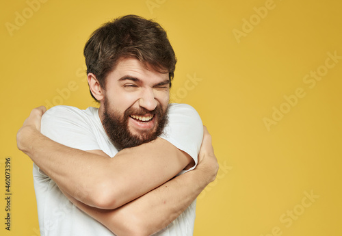bearded man in a white t-shirt hand gestures anger close-up