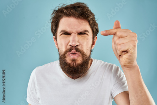 Bearded man in white T-shirt emotions gestures with hands displeased facial expression blue background