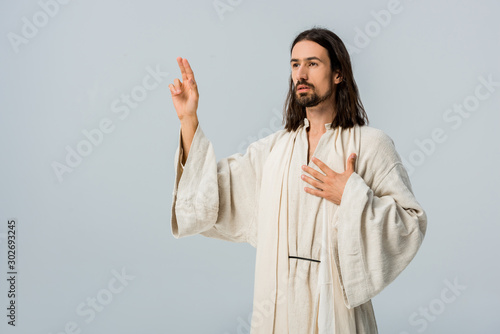 bearded man praying while gesturing isolated on grey