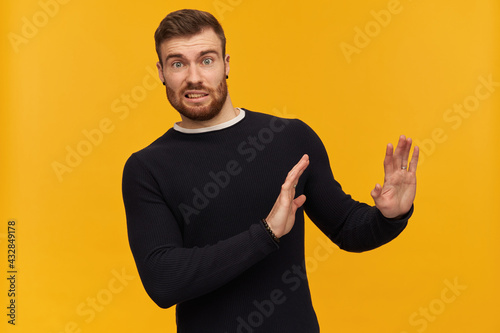 Bearded shocked guy, skeptical looking man with brunette hair. Has piercing. Wearing black sweater. Pushes arms away, reject gesture. Watching at the camera, isolated over yellow background