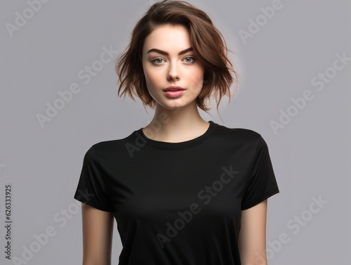 Beatiful handsome woman in black t-shirt. Realistic t - shirt mockup. Generative AI