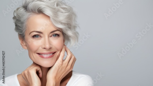 Beautiful 50 year old woman with clean fresh skin on a light background. Facial care, cosmetology, beauty and spa concept