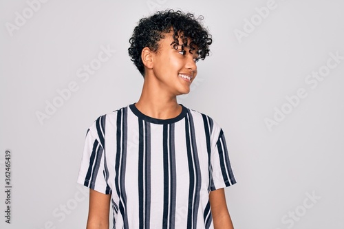 Beautiful african american afro woman wearing casual striped t-shirt over white background looking away to side with smile on face, natural expression. Laughing confident.