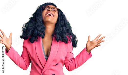 Beautiful african american woman wearing business jacket and glasses celebrating mad and crazy for success with arms raised and closed eyes screaming excited. winner concept