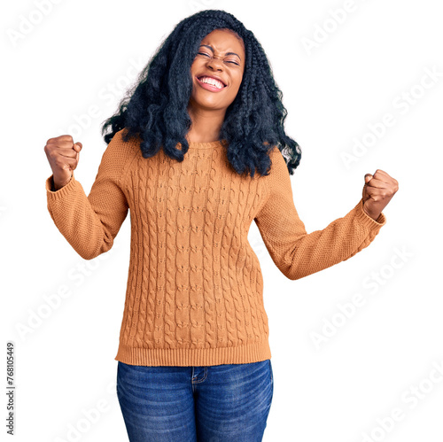 Beautiful african american woman wearing casual sweater excited for success with arms raised and eyes closed celebrating victory smiling. winner concept.