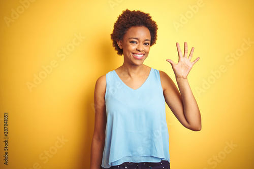 Beautiful african american woman wearing elegant shirt over isolated yellow background showing and pointing up with fingers number five while smiling confident and happy.