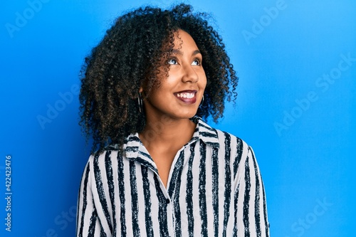 Beautiful african american woman with afro hair wearing casual clothes looking to side, relax profile pose with natural face and confident smile.
