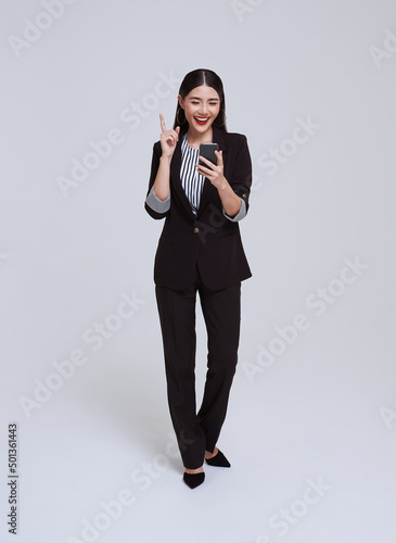 beautiful and friendly face Asian businesswoman smile in formal suit holding mobile phone over gray background.