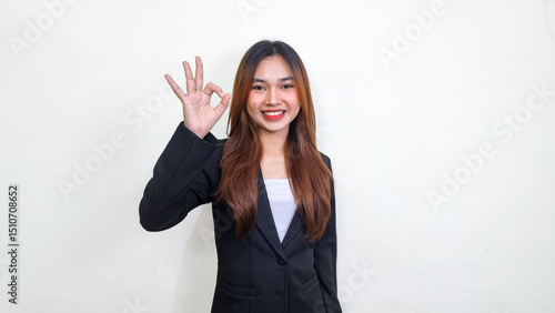 Beautiful and successful asian business woman. Confident office woman in black suit showing okay sign with her hands while smiling. Advertising marketing concept.