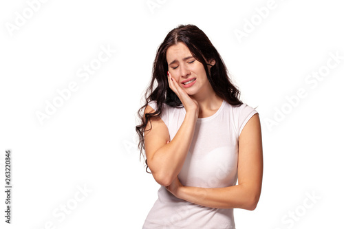 Beautiful and unhappy crying young woman with dark wavy hair with serious expression on her face.