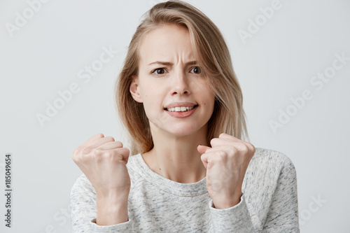 Beautiful angry furious European girl feeling dressed casually frowns face in dissatisfaction, keeps fists clenched, ready to protect herself and fight, feels offended. Negative emotions