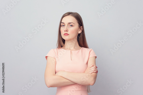 Beautiful angry girl in the pink dress, grey background, portrait, toned