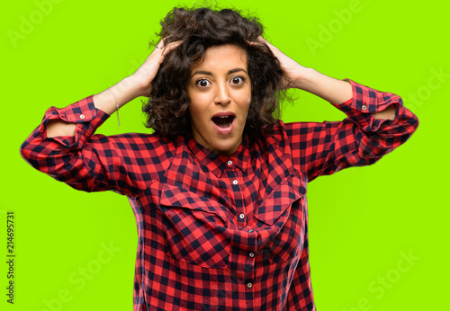 Beautiful arab woman happy and surprised cheering expressing wow gesture
